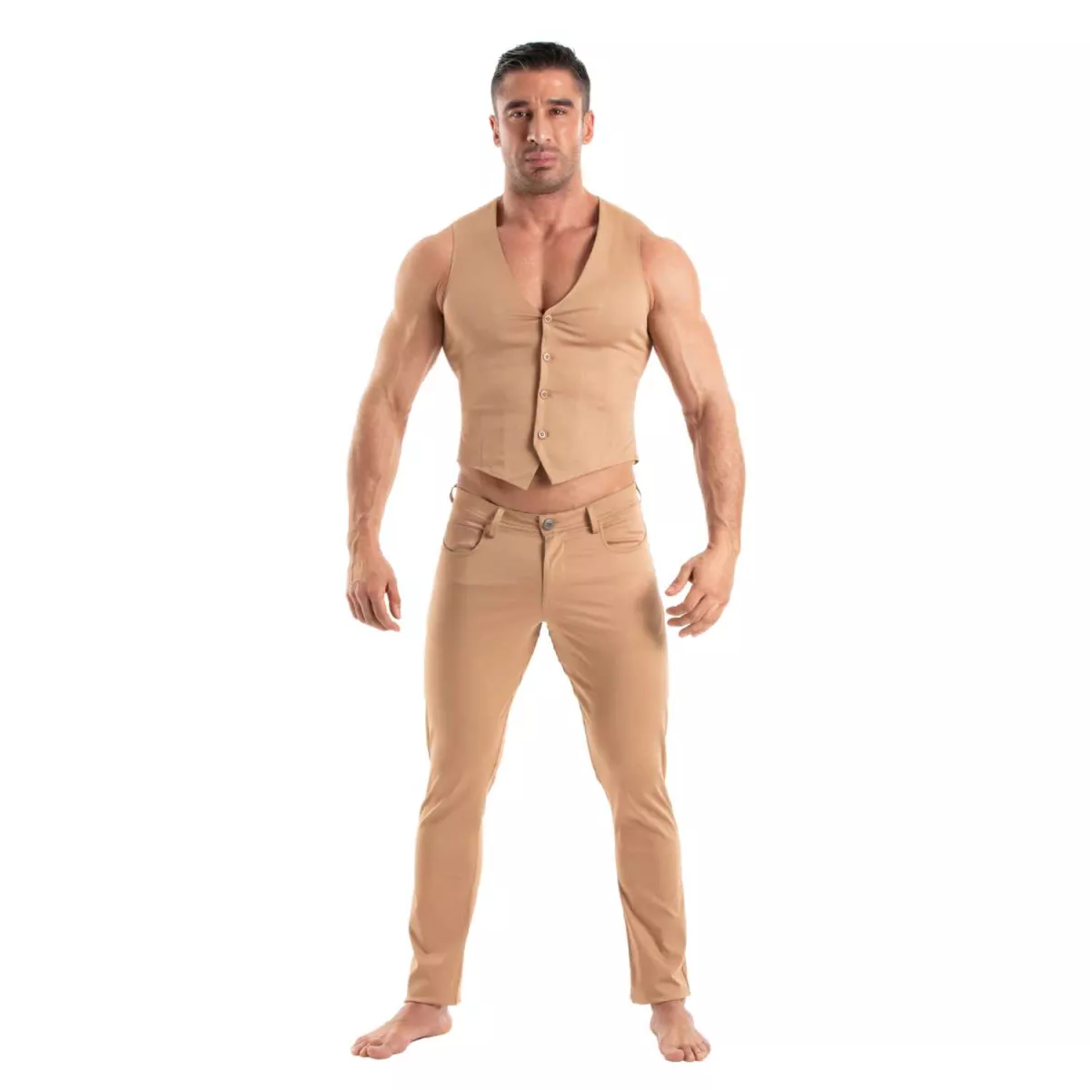 “The men's chino vest is a must-have for any modern wardrobe. Its stretch fabric offers absolute comfort, while its slim fit enhances any body type. It pairs effortlessly with a men's tank top or a sleeveless bamboo hoodie. A versatile and stylish piece.”