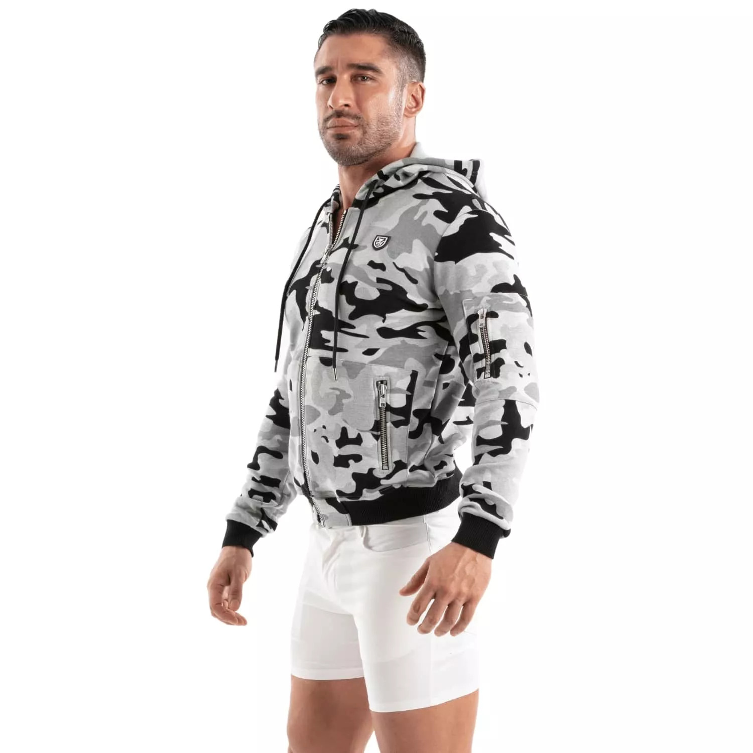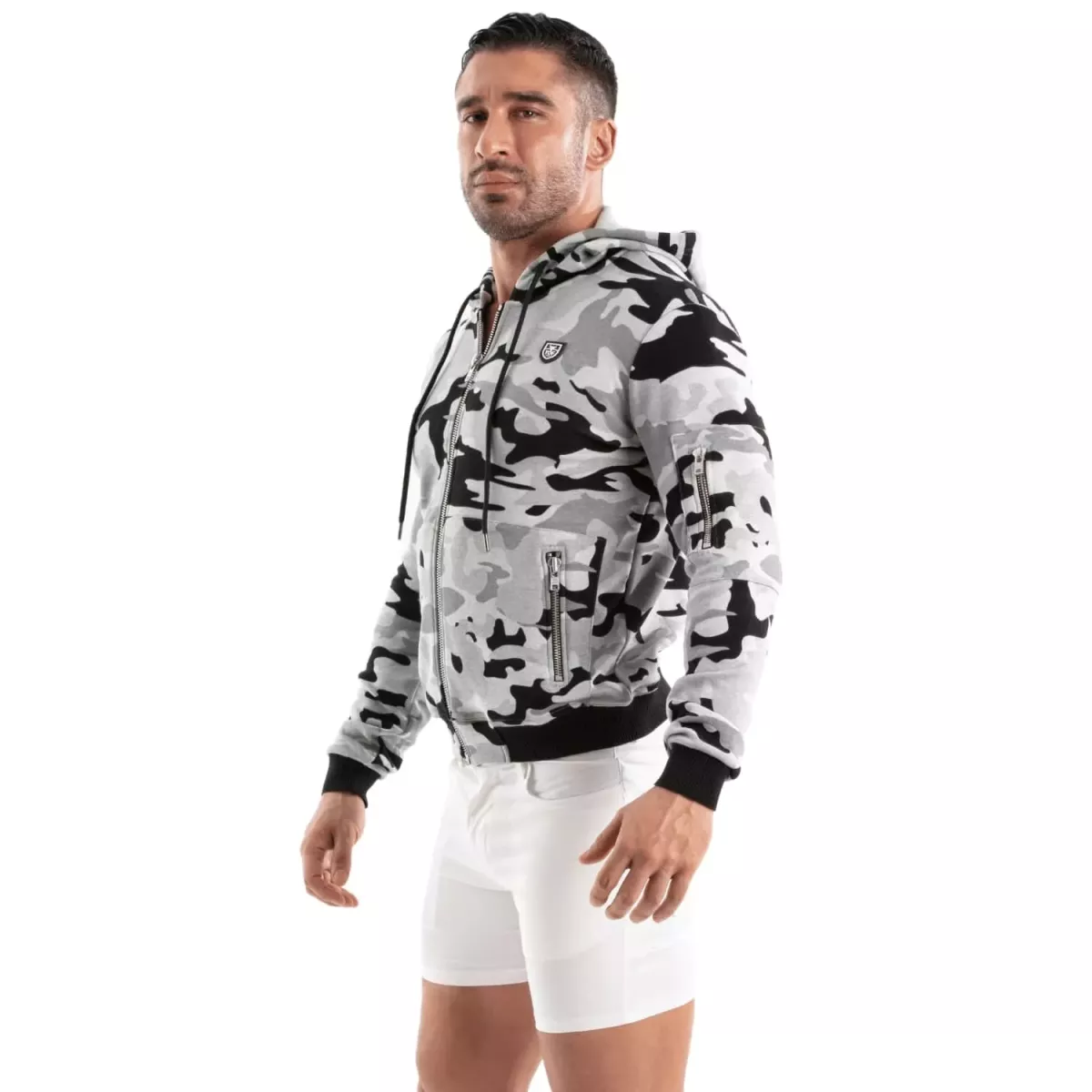 "The TOF Paris men's hoodie strikes the perfect balance between style and comfort. The camouflage pattern, premium finishes, and warm fleece fabric make it a must-have for mid-season. Pair it with the Temptation Microfiber White Boxer or the Temptation Microfiber Red Bikini for a bold, sexy look."