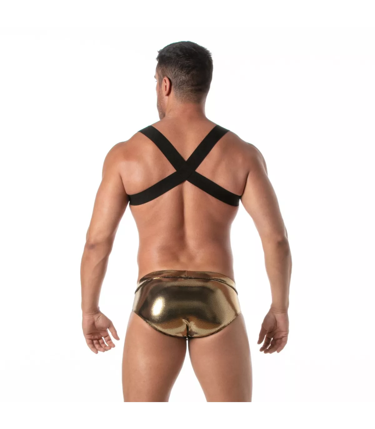 Turn heads with the fiesta zipped pocket harness gold from TOF Paris, a festive harness with a bold design, perfect for your wildest nights out. Made from metallic swimwear fabric, it's lightweight, quick-drying, and built to shine. Its standout feature? A built-in zip pocket to carry your essentials discreetly. The wide elastic straps form an X-shape at the back, enhancing your shoulders and adding instant visual appeal. Wear it solo or layered over a T-shirt for a sleek clubwear or festival look. The laminated faux leather TOF Paris logo patch on the side adds a touch of fetish-chic signature.