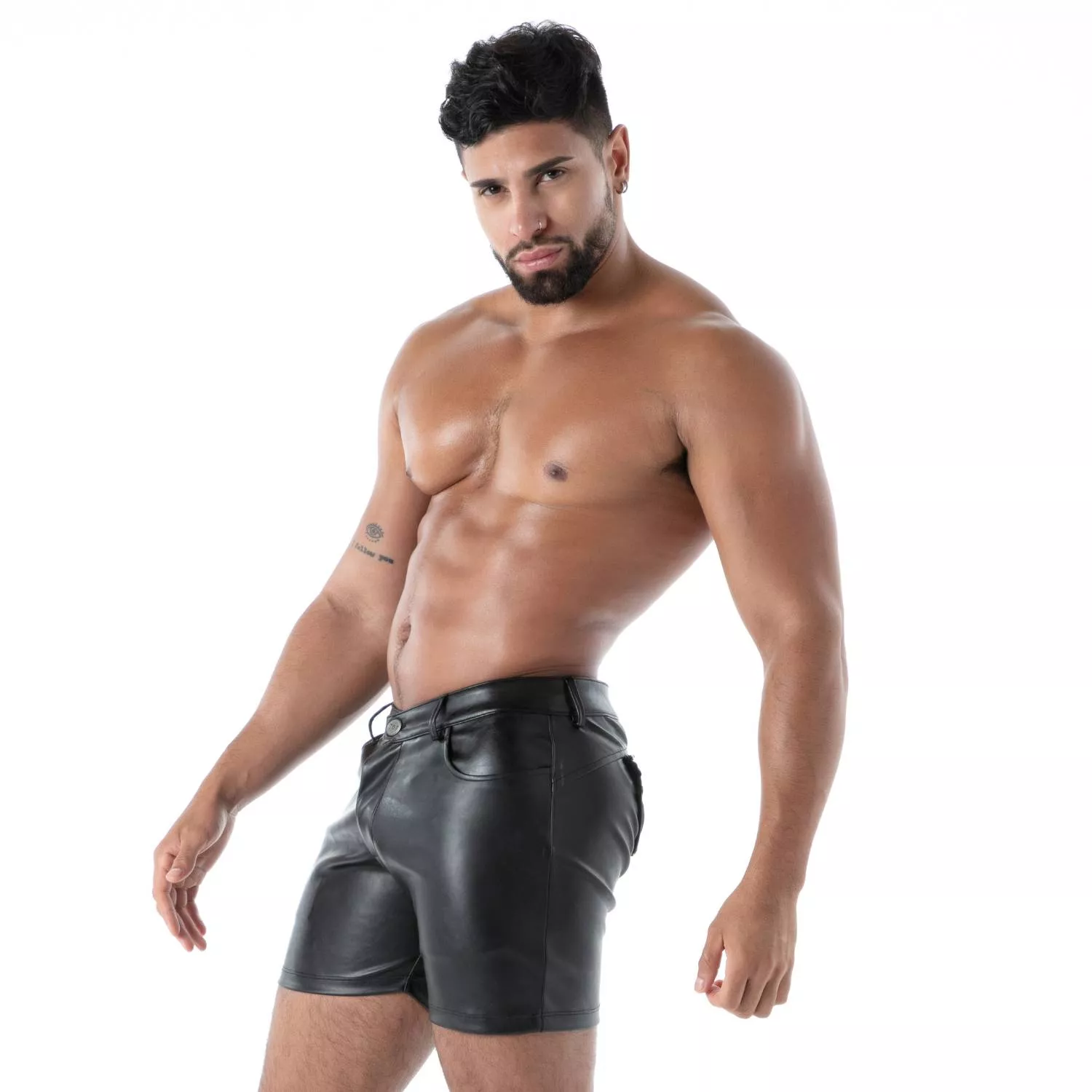 To take your outfit to the next level, wear the short with a men’s leather harness or a tight-fitting t-shirt like the kinky t-shirt. These combos create a bold, modern look, totally in tune with today’s clubbing scene.