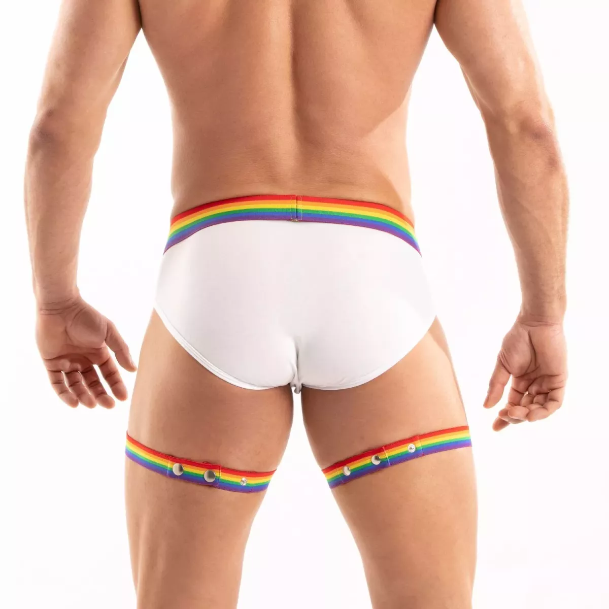Discover the Pride Leg Harness in vibrant rainbow colors : a bold, celebratory men's accessory inspired by the garter belt, reimagined with a proud, masculine edge. Adjustable and eye-catching, they’re sold as a pair for a bold, coordinated, and expressive look.