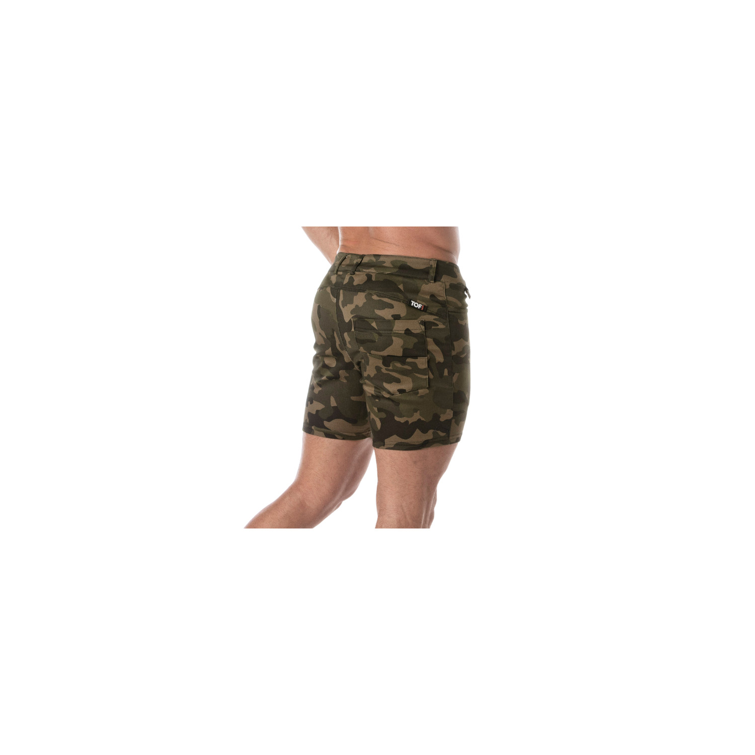 These camouflage-patterned shorts combine masculine appeal and comfort with their slim fit and stretchy fabric. Practical and stylish, they feature three functional pockets, belt loops, and a metallic zip fly for a flawless look. Carefully crafted in our Parisian workshops, they embody urban elegance with the TOF Paris silicone logo subtly placed on the back.