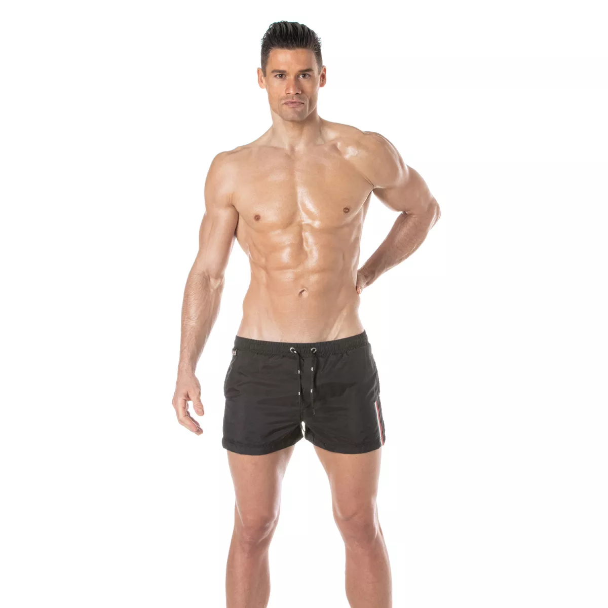Discover our Mid Thigh Swim Shorts in Black: low-rise, slim fit for men, featuring a "cocorico" touch with a tricolor stripe, practical pockets, matching drawstrings, Parisian-crafted.