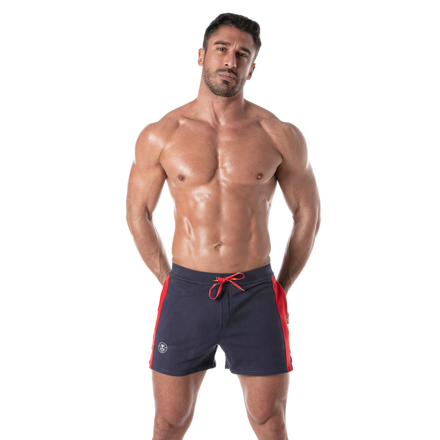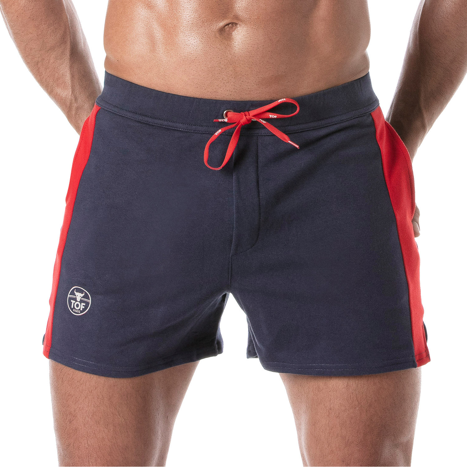 Discover the football sexy shorts, the epitome of style and comfort for men who want to express their personality. Inspired by football gear, these low-rise mid-thigh shorts stand out with their bold design and refined details. Made from stretch french terry, they perfectly hug your curves while offering optimal freedom of movement. With their contrasting side stripes and TOF logo, these shorts are ideal for completing your chic sportswear look.