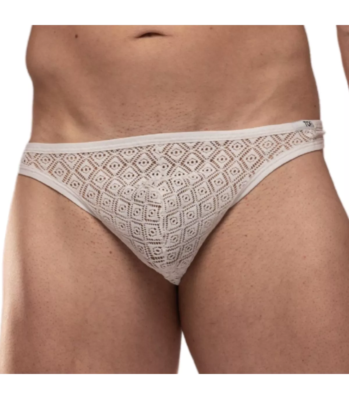 Original thong in stretch lace – Unlined front pouch – Elastic bias trim – TOF Paris logo sewn at the waist – Designed and sewn in Paris.