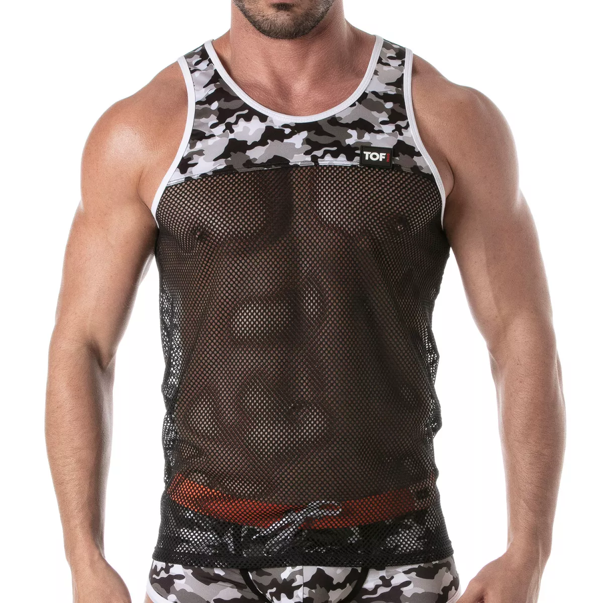 Embrace a sporty and seductive look with TOF Paris's men's sport tank top. This unique design blends a modern style with innovative materials to deliver an unparalleled aesthetic. Featuring transparent mesh and grey camouflage inserts, this tank top is perfect for men who want to make a bold yet elegant statement.