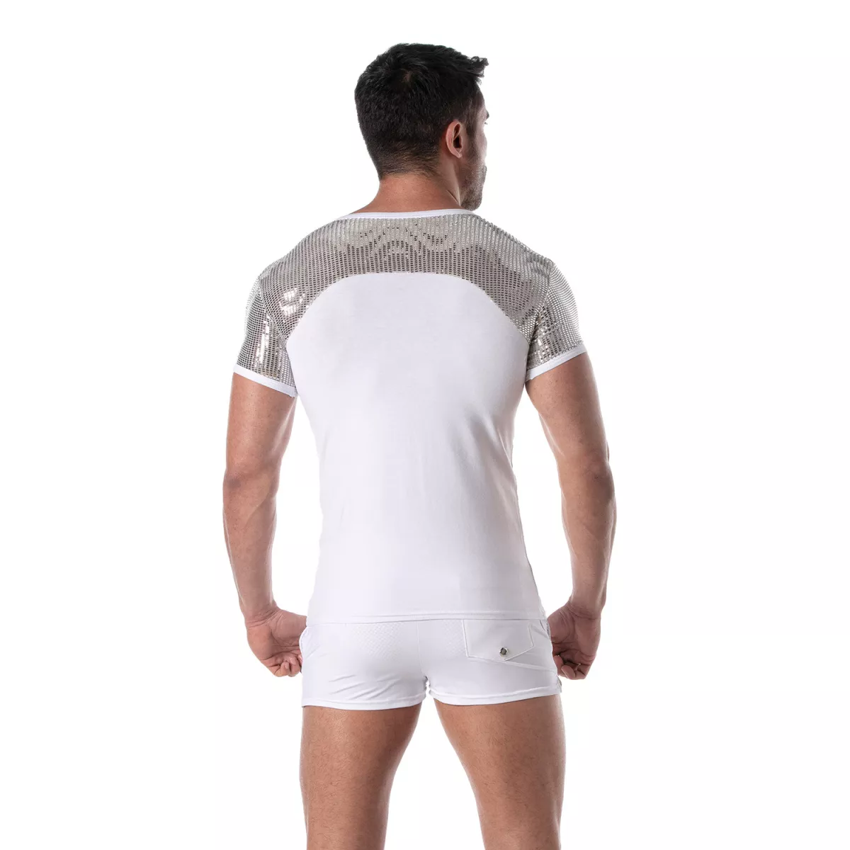 "The TOF Paris Silver Glitter T-Shirt is the perfect piece to shine with elegance. Worn with short shorts or a sexy thong, it transforms any outfit into an unforgettable look. Ideal for men who want to stand out in style."