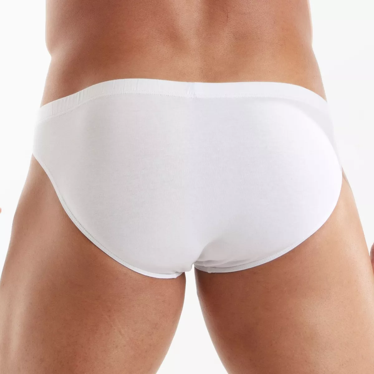 White low-rise bikini brief with a high-cut silhouette, 93% cotton/7% elastane. Made in France, available XS-XXL; timeless, comfortable, and elegant.