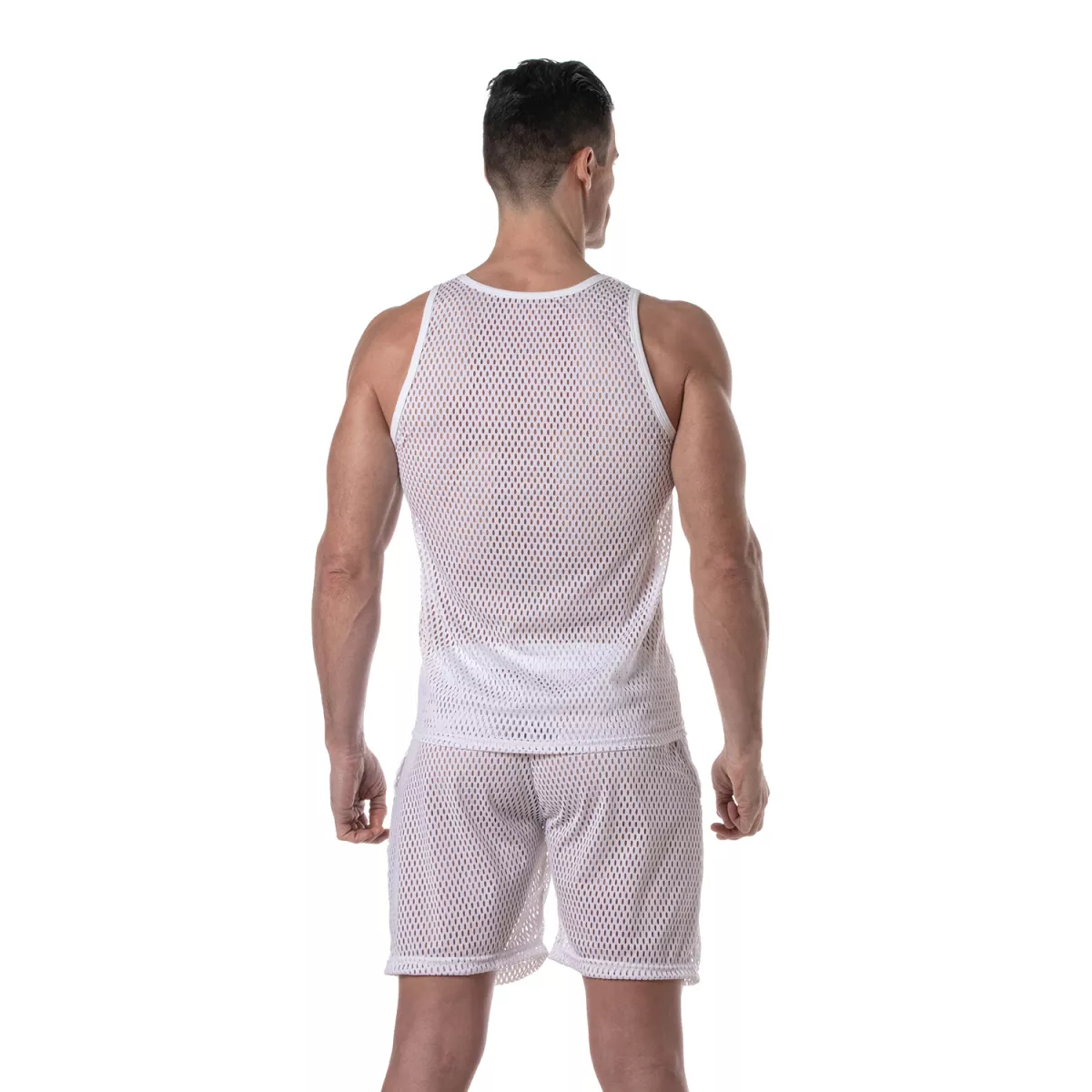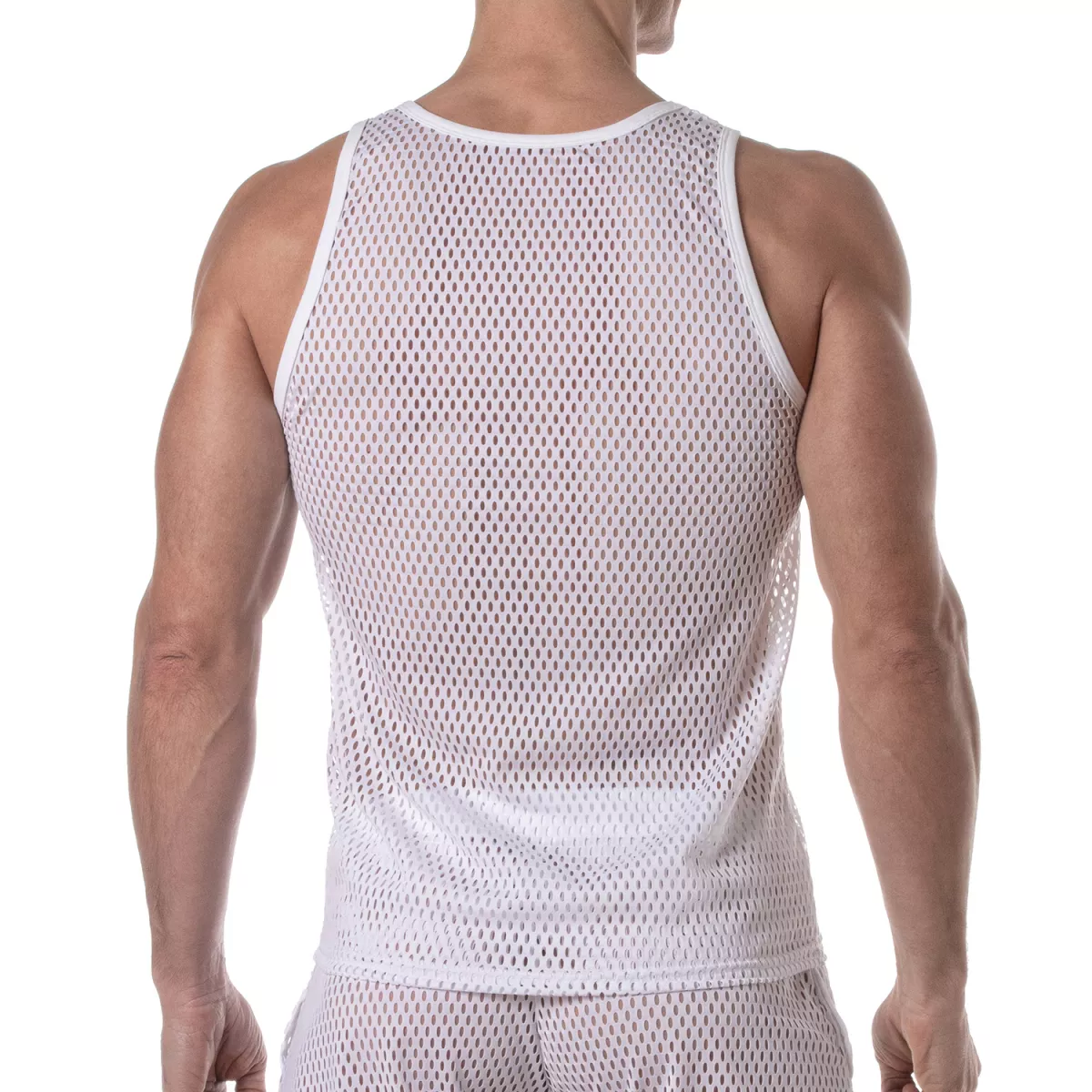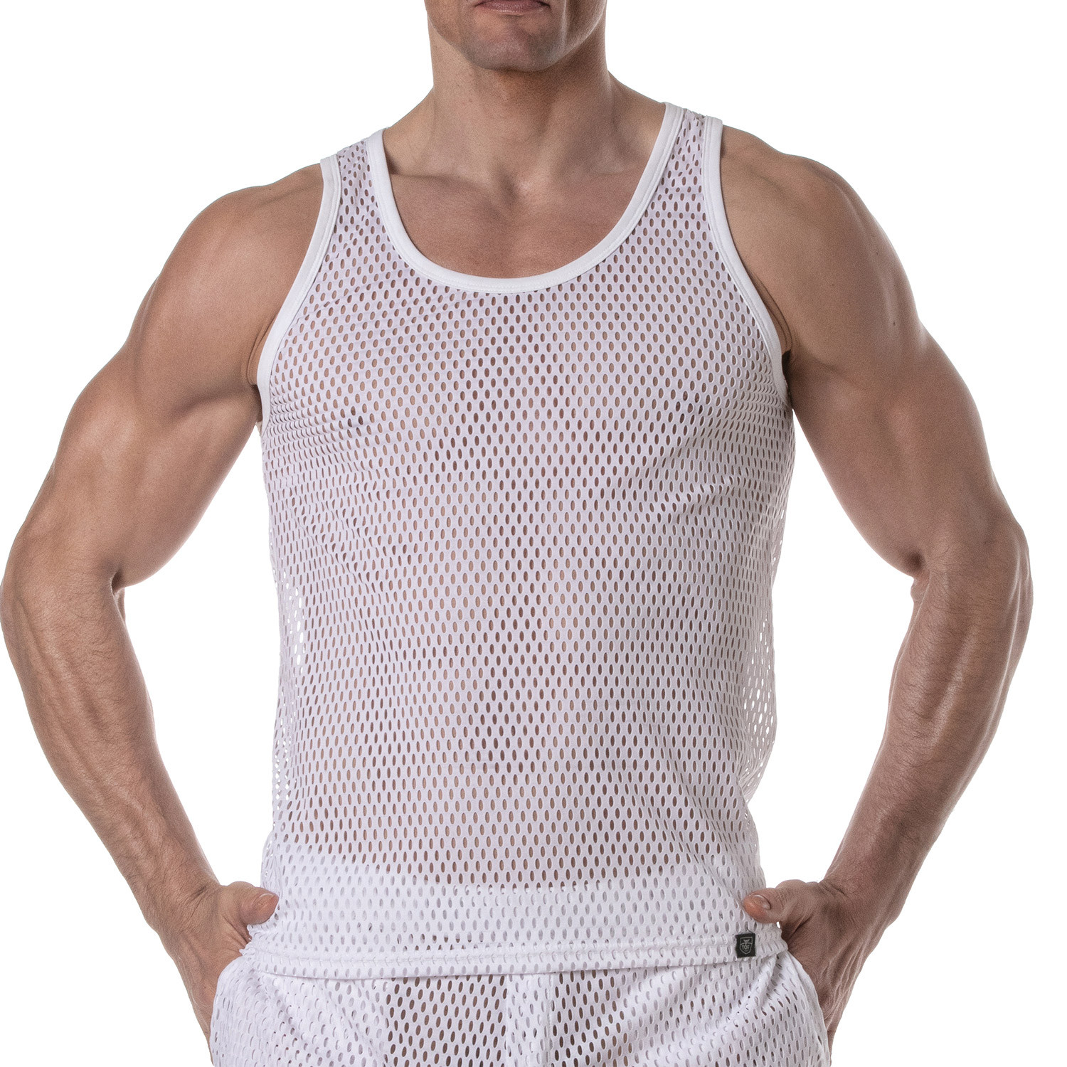Découvrez le Débardeur en maille transparente, un débardeur sexy en résille de TOF Paris. Haut sans manche ajouré avec logo élégant, conçu et fini à Paris. Lavage facile à 30°.