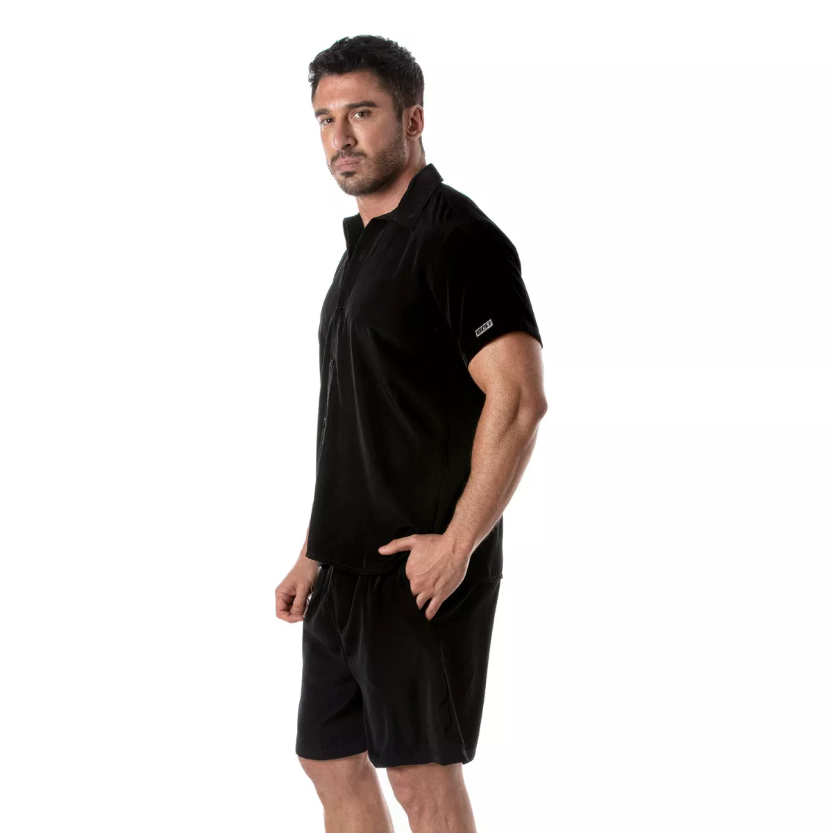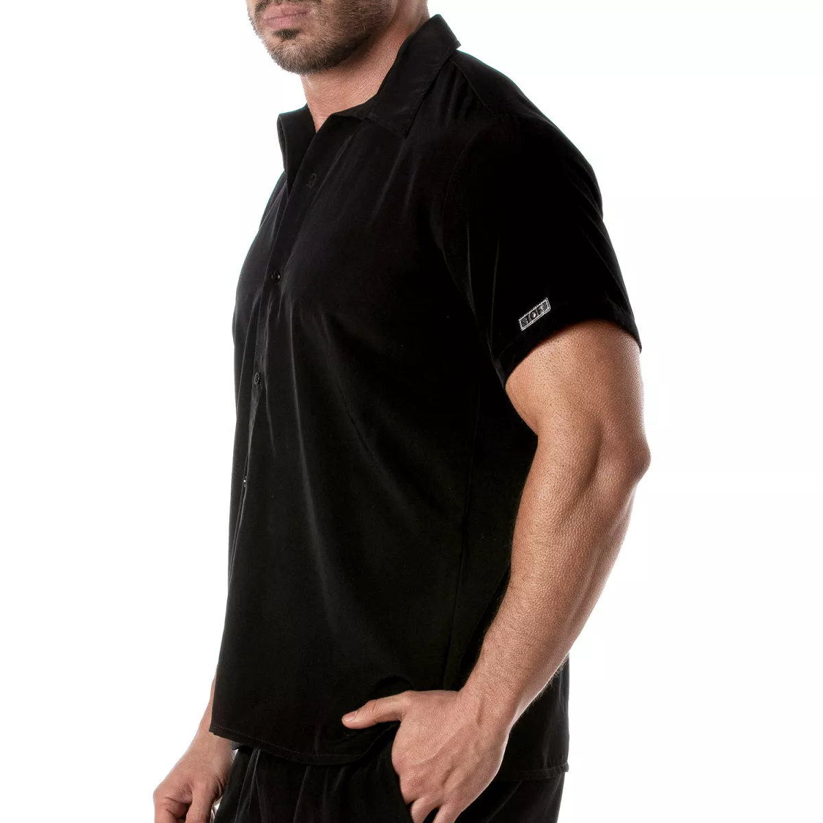 "Cette chemise est un must-have pour tout homme cherchant à allier confort et élégance pendant les mois chauds. Son tissu léger et sa coupe décontractée en font un choix idéal pour toutes les occasions estivales. J'apprécie particulièrement le détail du logo en similicuir qui apporte une touche de sophistication. Associez-la avec un short Sexy Patriot - Noir pour un look chic et décontracté."