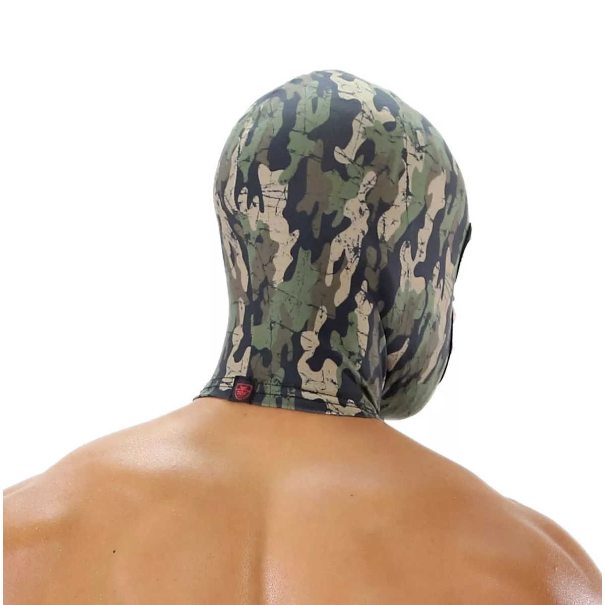 Cagoule SM à 3 trous en microfibre motif camouflage. idéale pour les jeux sexuels de domination et de soumission.
