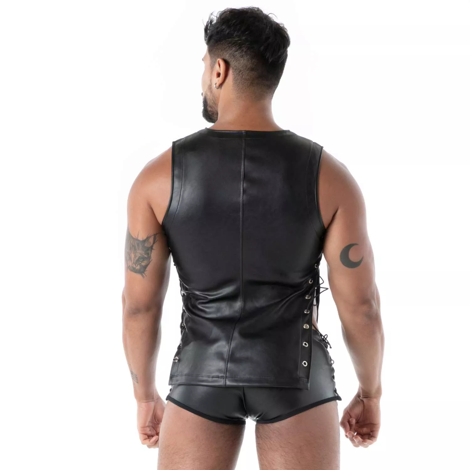 Le débardeur à lacets kinky noir est confectionné dans une matière de qualité, résistante et confortable. Sa coupe ajustée épouse le torse et les épaules, pour un rendu à la fois viril et ultra sexy. Les œillets robustes permettent de jouer avec le laçage selon vos envies, tandis que le zip à l’encolure facilite l’habillage… ou le déshabillage. Chaque détail a été pensé pour sublimer la silhouette masculine tout en garantissant un port confortable.