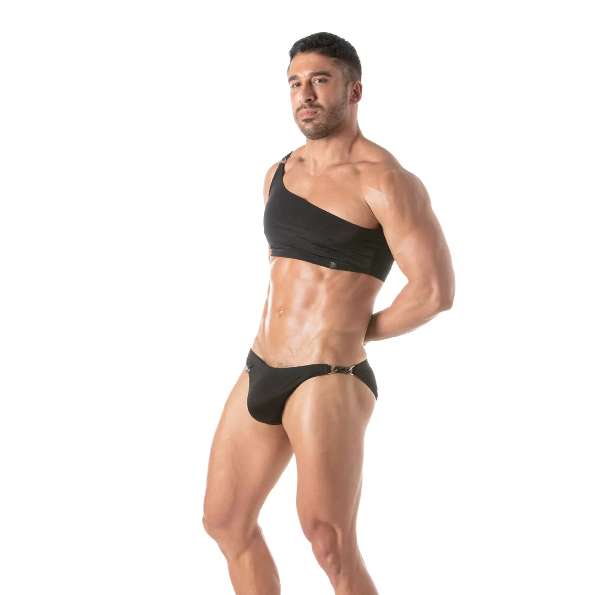Chaque détail, de la coupe asymétrique à la bretelle chaîne robuste, fait de ce haut le sommet de l'apparel fetishwear. Il est versatile, se mariant sans effort avec des pièces comme Bikini Iconic - Marinière bleu-marine pour un look de plage harmonieux mais edge, ou en faisant une déclaration audacieuse aux côtés du Shorty de bain Floral Jaune pour ces journées ensoleillées.