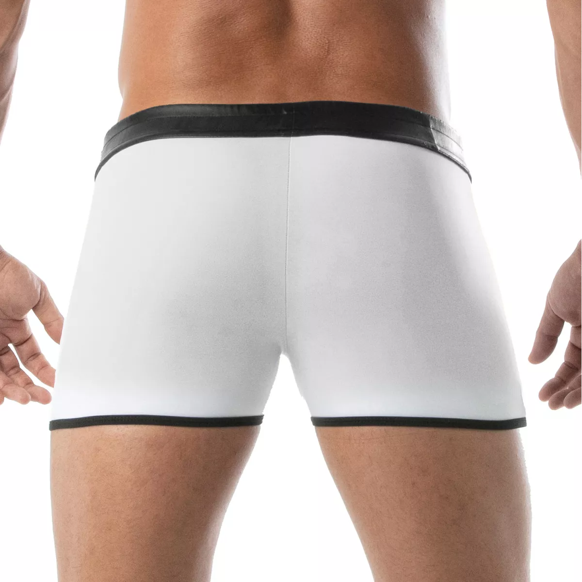 Ce short fetish est conçu pour sublimer la silhouette masculine. Son tissu en lycra extensible assure une coupe ajustée qui met en valeur les courbes tout en offrant une liberté de mouvement totale. L’association d’un empiècement effet cuir et d’une poche avant contrastée en fait une pièce incontournable pour ceux qui veulent se démarquer.