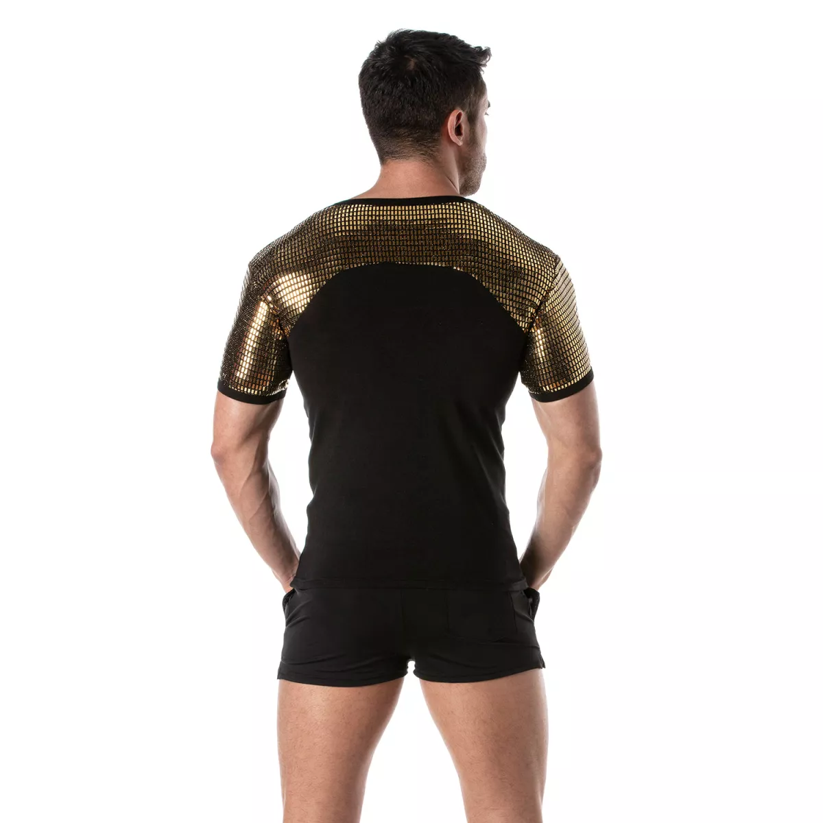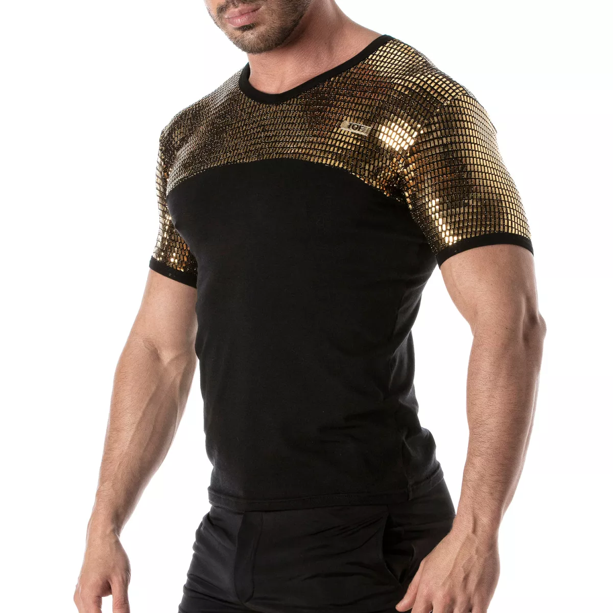 Faites sensation avec le t-shirt sexy homme à paillettes or signé TOF Paris, une pièce idéale pour les soirées festives et les événements élégants. Fabriqué avec soin dans nos ateliers parisiens, ce t-shirt associe confort et audace. Les paillettes scintillantes, doublées à l’intérieur, assurent un contact doux sur la peau, tandis que le logo TOF Paris en similicuir, placé côté cœur, apporte une touche raffinée.